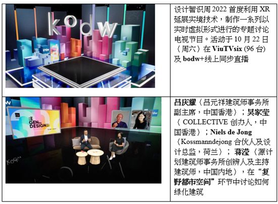 中国香港,2022年10月24日——汇聚40多位来自世界各地不同领域的精英、企业家和创意领袖的"设计智识周2022"(Knowledge of Design Week,KODW 2022)专题讨论正式于10月22日圆满落幕。活动自 9 月起在ViuTVsix(96台)播出一系列讨论环节,同时于 8 月 至 10 月期间主办多项在线及线下工作坊。另外, ViuTV 99 台亦将于 11 月 12 日播出一小时粤语精华片段,节目集合了一众讲者精辟独到的见解,记录活动既具启发性又精彩的时刻。